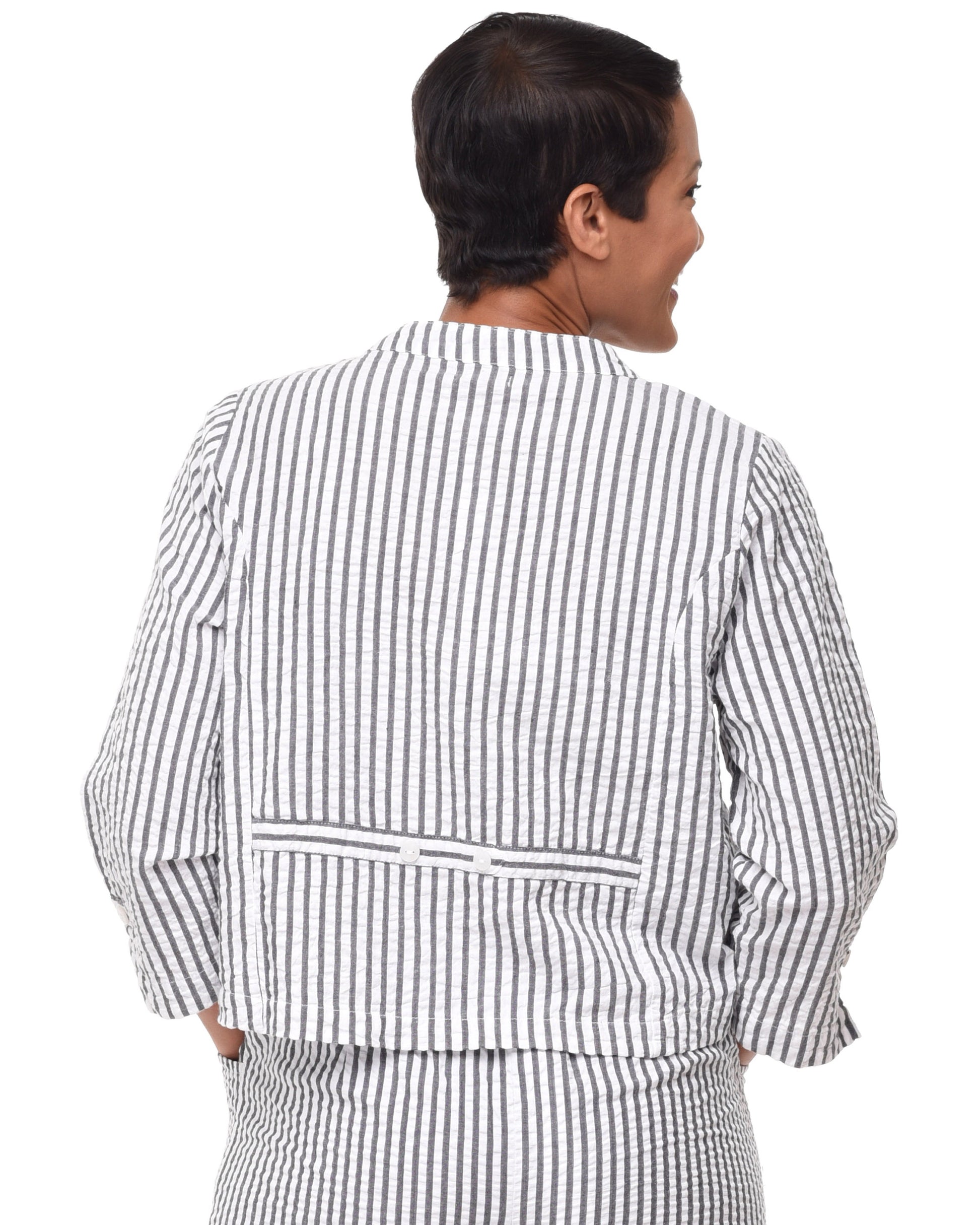 A modern jacket with easy polish, the Dakota adds crisp structure without ever feeling stiff. Crafted from 100% breathable cotton with a puckered texture and soft drape, it features a collarless neckline, button front, and cropped, boxy fit that layers effortlessly over dresses or high-waisted pants. Three-quarter sleeves with a tab detail give it a relaxed versatility, while a back yoke with horizontal stripe detail adds unexpected contrast. Finished in the Murphy Seersucker Stripe, it has a fresh, graphic edge—perfect for adding visual pop while staying completely wearable.