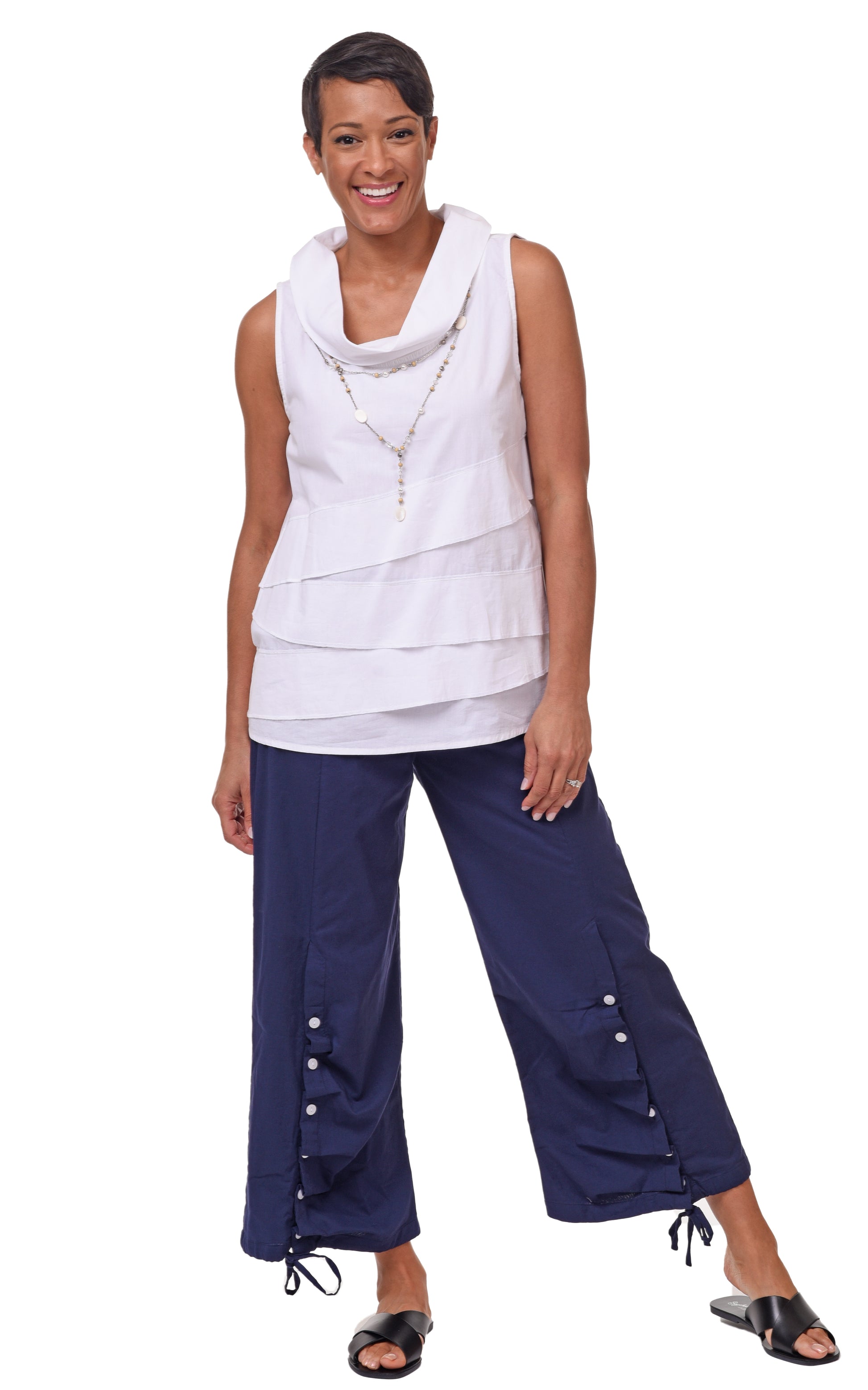 A fresh take on summer layering, the Leilani Top brings soft structure and sculptural ease to your warm-weather wardrobe. Crafted in crisp cotton, it features a wide, gently draped cowl neckline and horizontal pleated tiers for added texture and movement. Sleeveless and easy-fitting, this top is made to keep you cool while looking effortlessly styled. Pair it with anything from wide-leg pants to sleek crops — it holds its own without trying too hard.