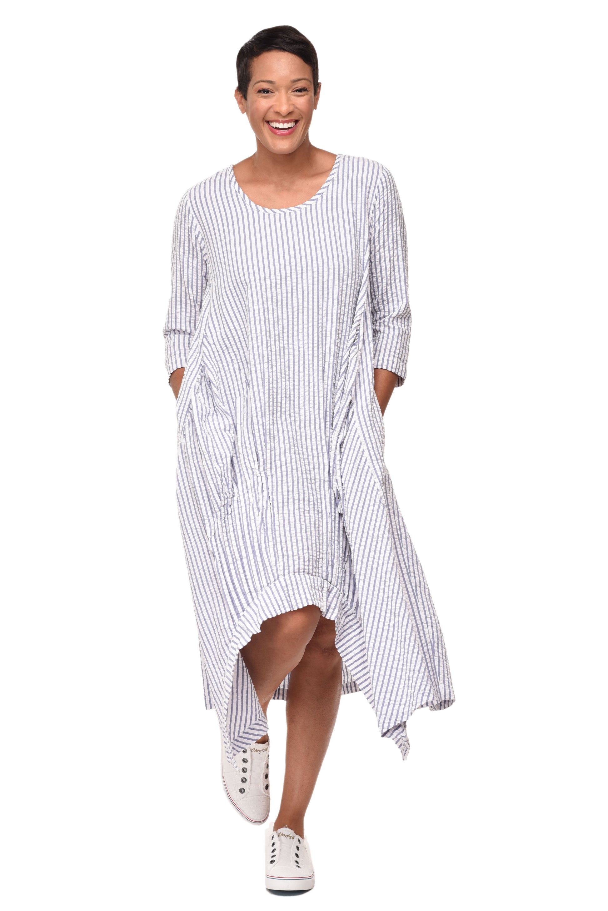 This Lexi Dress features 3/4 length sleeves, as well as elegant tucks and practical pockets for added functionality.