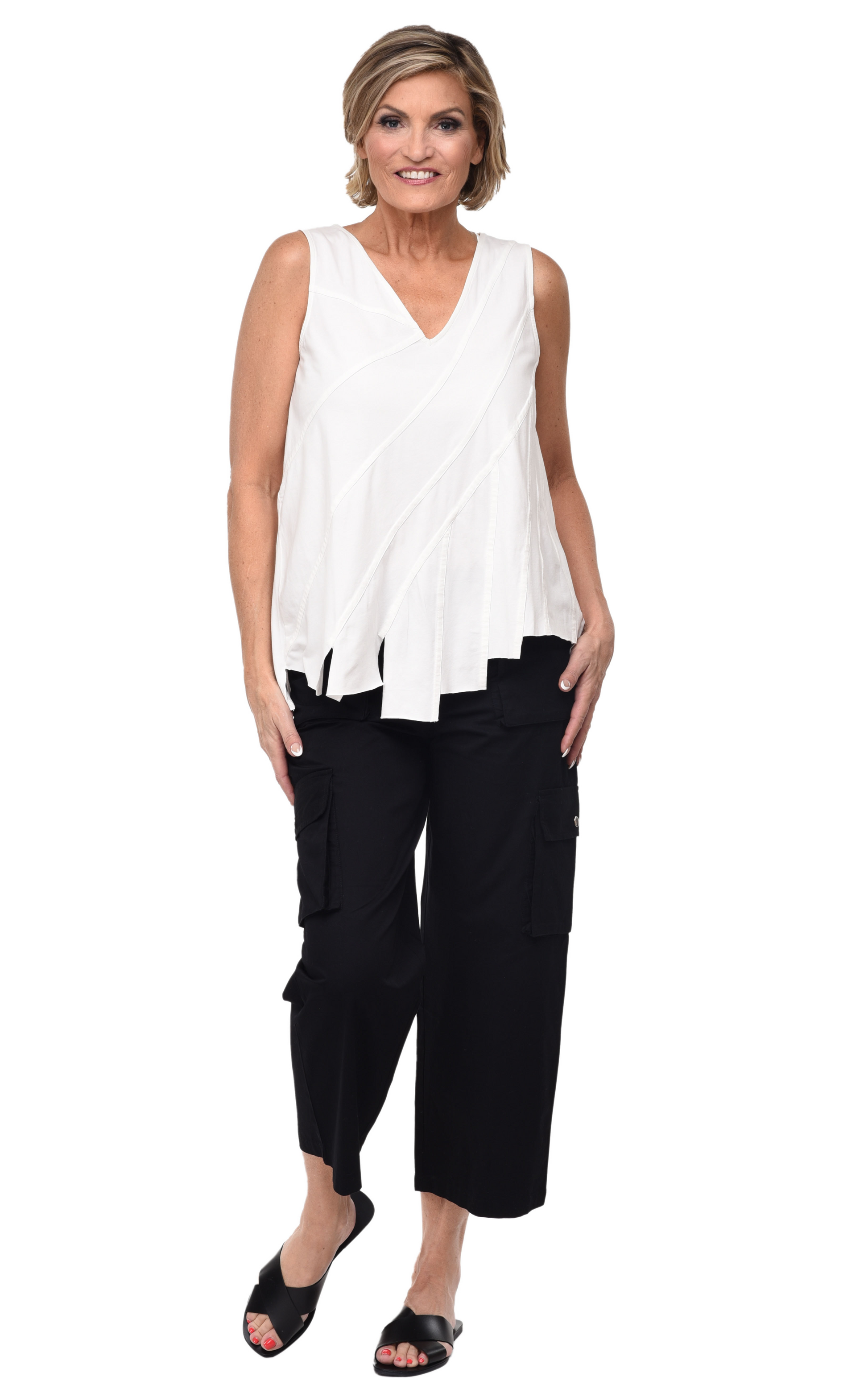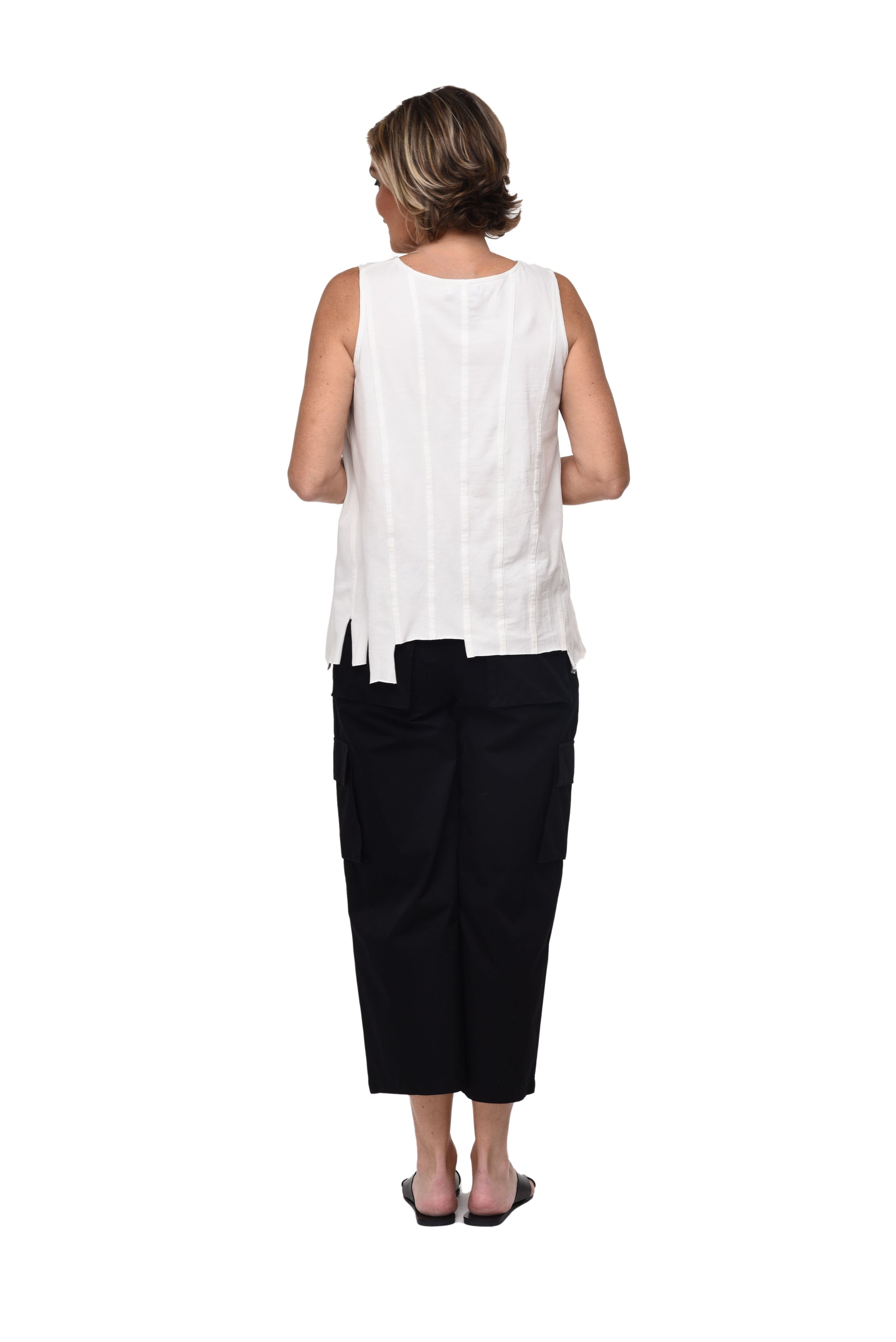 Sleeveless V-neck tank with asymmetrical folds on front and back and decorative raw edges at the bottom.