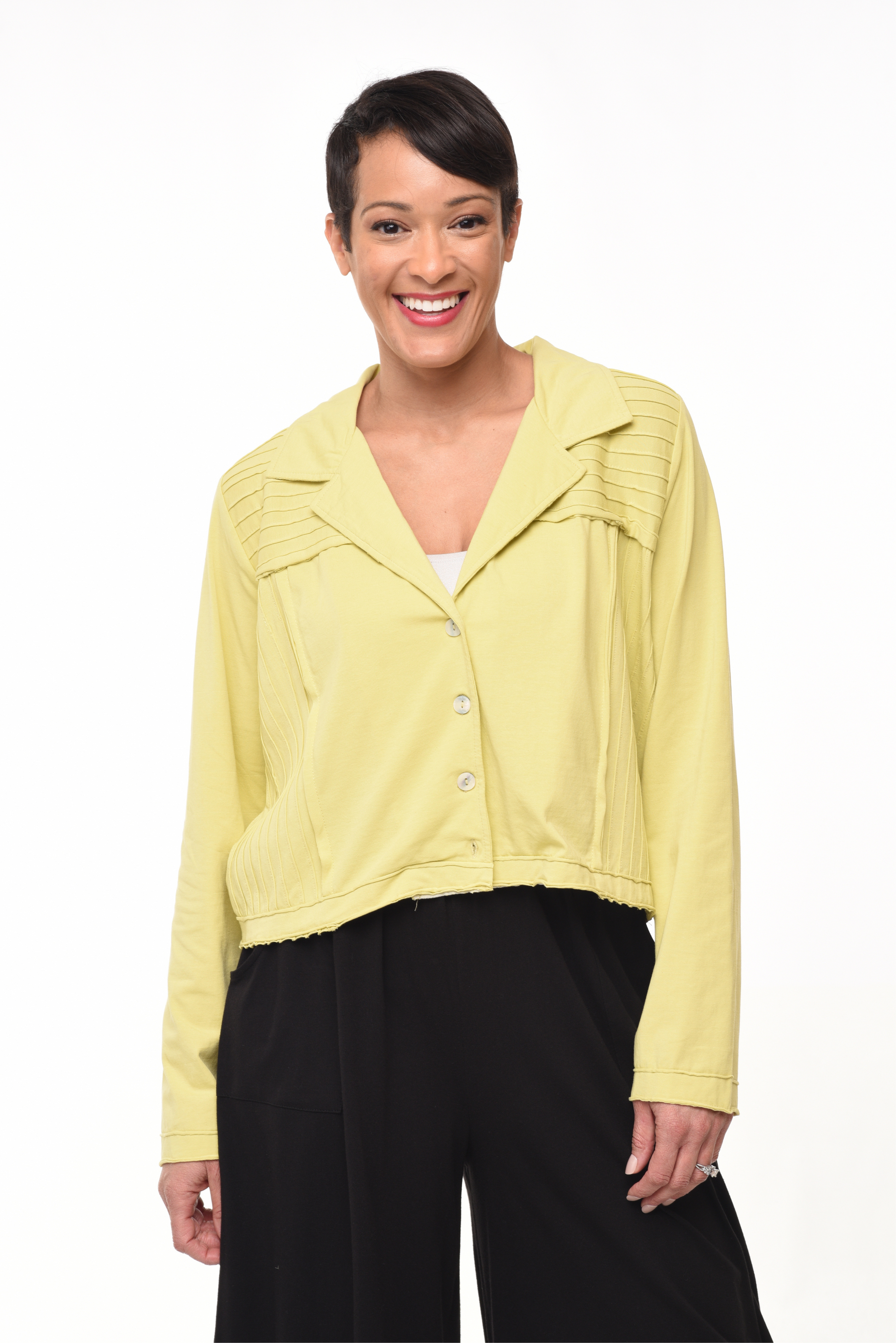 Notched-two-point collared button-down, bold pintuck detailing, and full-length sleeves with no pockets .