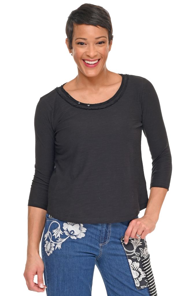 Upgrade your wardrobe with the Bowen Top—a sophisticated blend of style and elegance. Designed with flattering 3/4 sleeves and a scoop neck tank, this chic piece is accented with decorative raw edges and button details for a unique touch. Experience effortless luxury with this exclusive must-have.