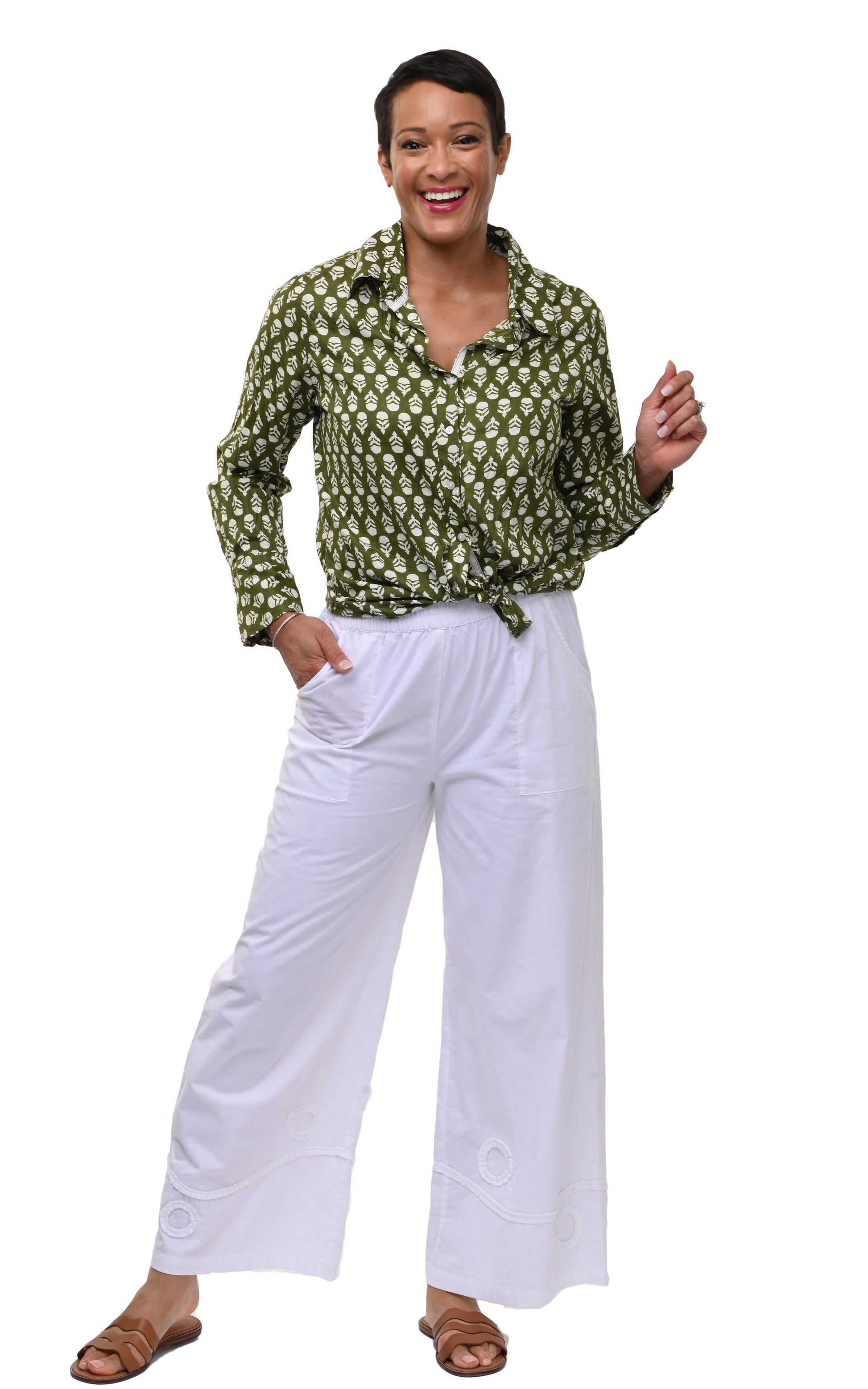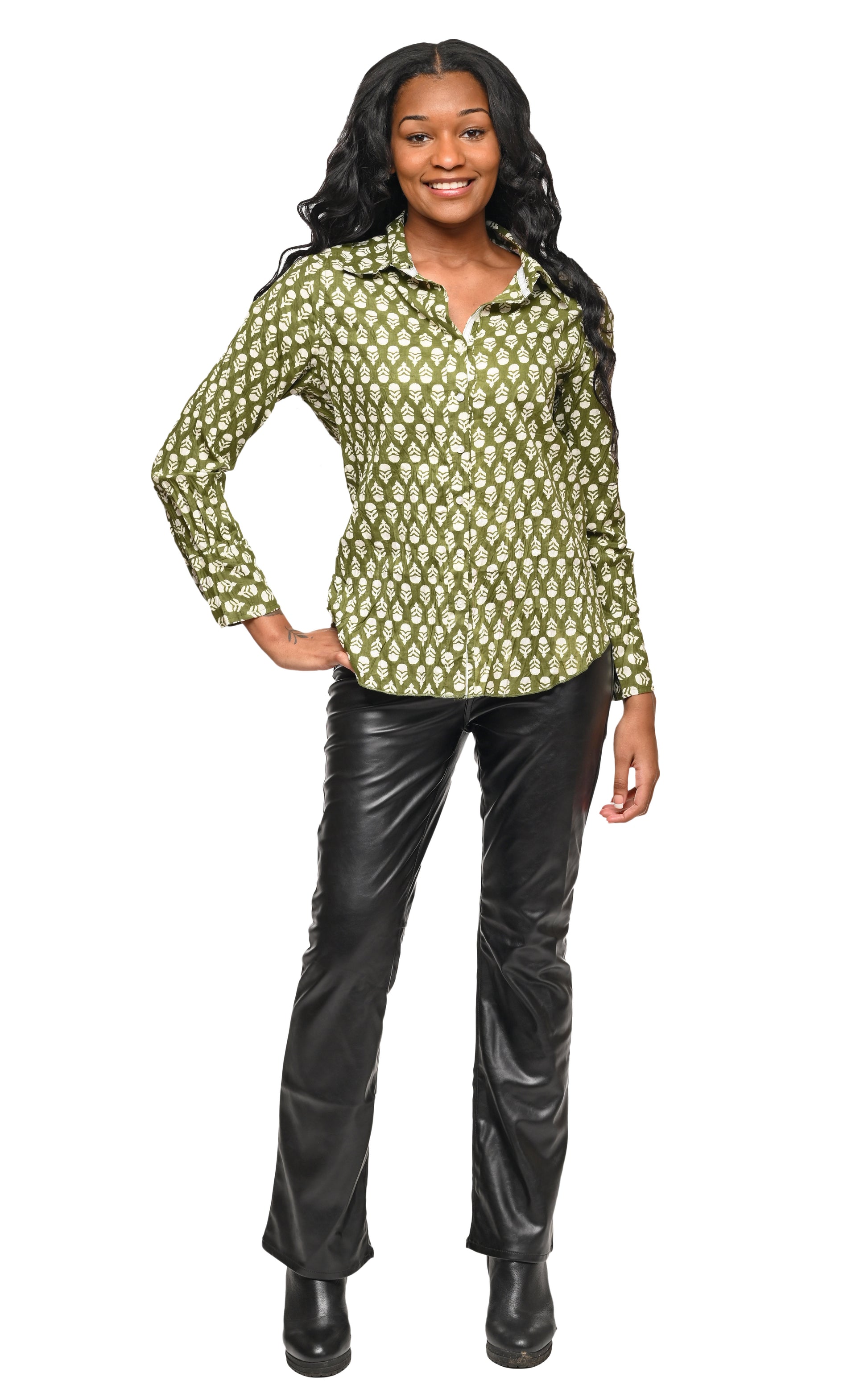 Crinkled button-down blouse, featuring ribbon trim and cuffs. Runs smaller than most Tulip.
