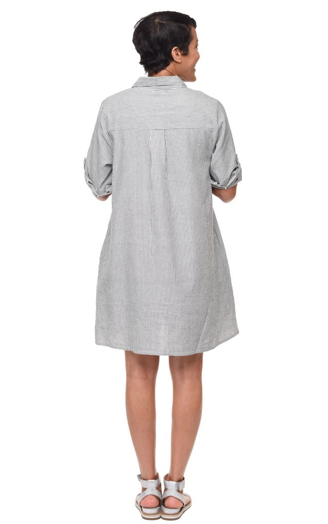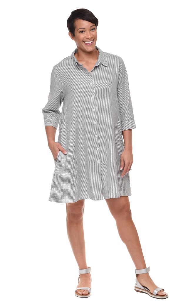Knee length button-down dress in ticking stripe with contrasting stripe panels, side pockets and 3/4 sleeves.