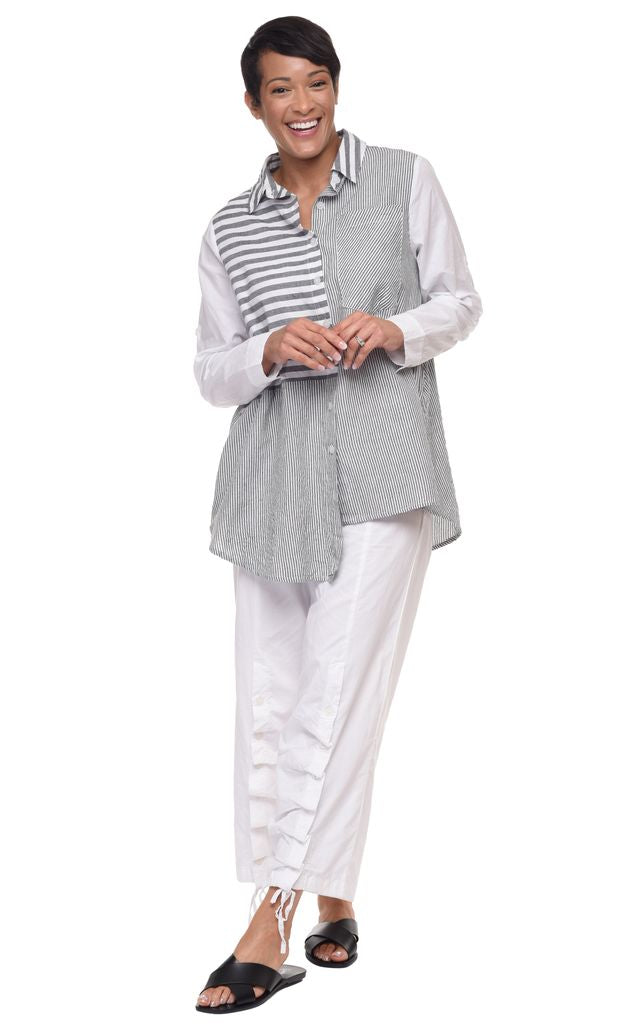 Button down with asymmetrical front, mix pattern blocking details, long sleeves that can be rolled with a tab, side seam pocket and chest pocket.