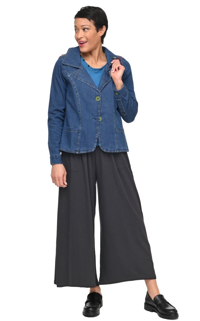 D508 Coachella Jacket is crafted from premium denim, this jacket features a large two-part collar and back pleats for a unique and sophisticated look. Front pockets and detailed stitching add a touch of functional elegance, while cute button details on the collar complete the look.