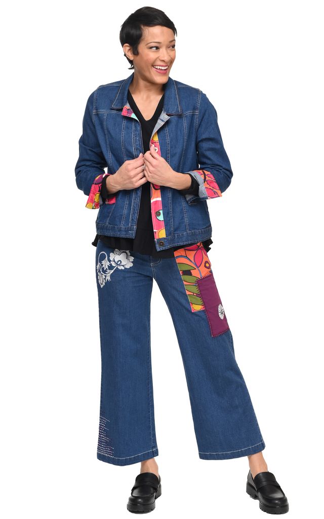 Wylie Denim Pant crafted with stretch denim and a medium rise, this pant offers both comfort and style. Front and back pockets provide practicality, while unique patches, kantha stitching, and embroidery add an artistic touch.
