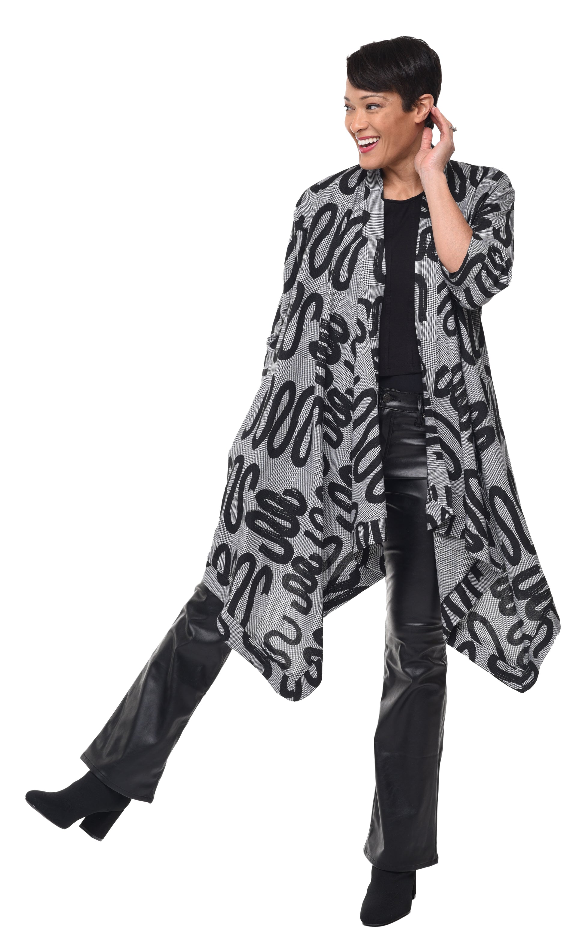 Bold, versatile, and effortlessly modern. This draped jacket layers beautifully over any outfit, with a flowing open front that can be worn loose and relaxed or belted for shape. The abstract plaid-meets-paint print adds a playful burst of color—pops of fuchsia, yellow, and blue against a neutral base—making it an easy statement piece for everyday wear.