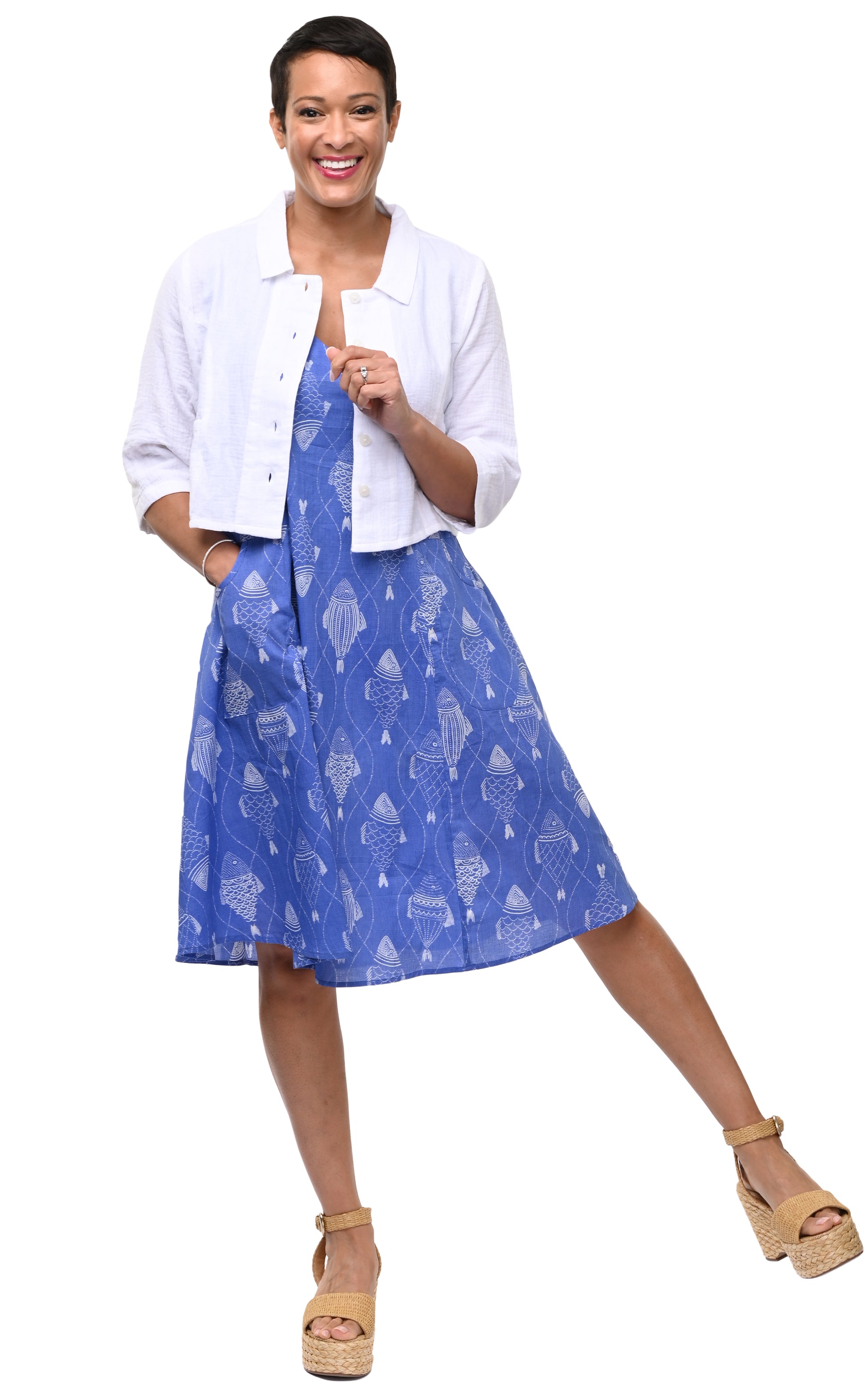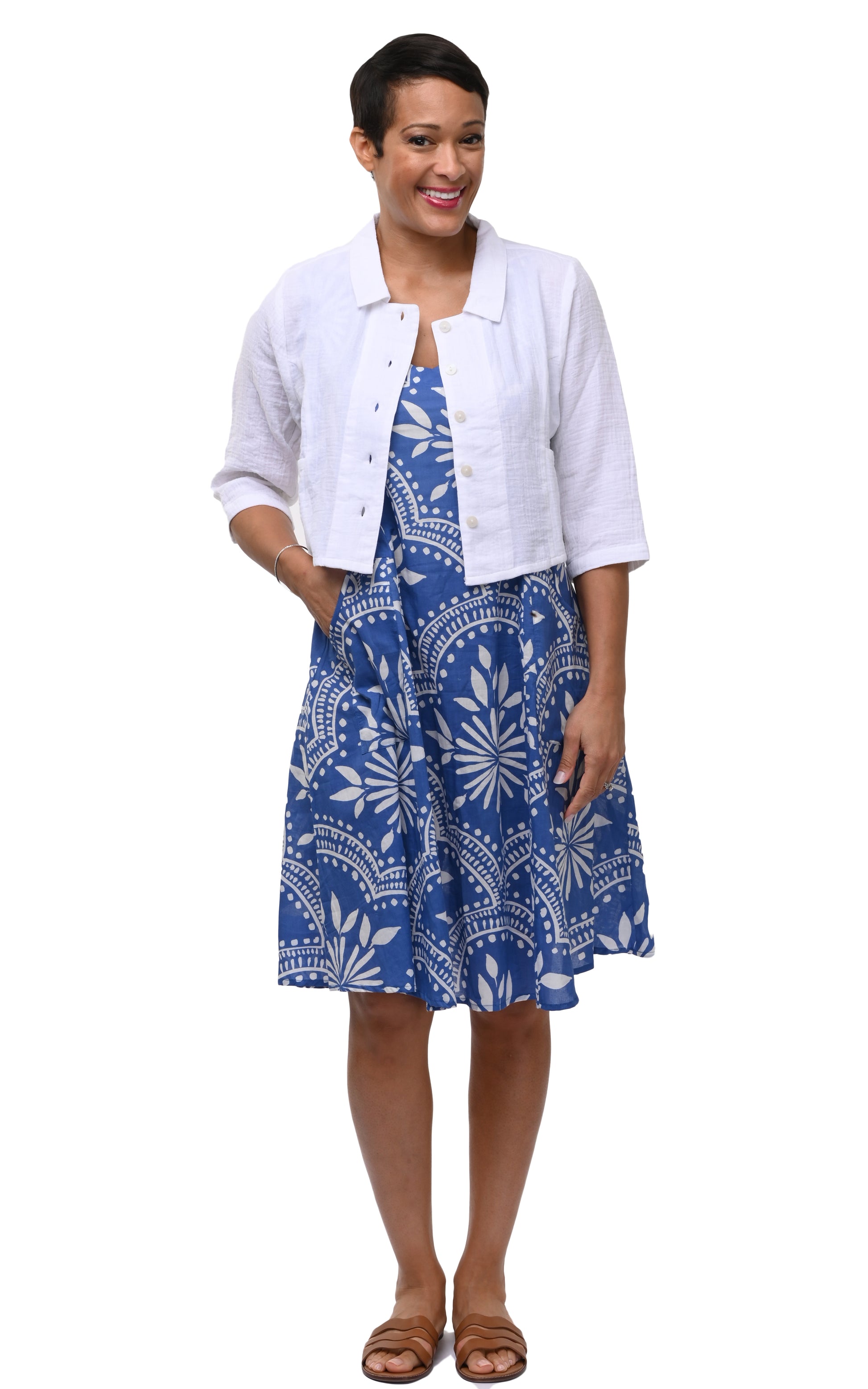 The Parker Jacket (VCG503) is your go-to lightweight layer. Crafted in 100% cotton gauze, it’s breathable, soft, and naturally textured. With its cropped silhouette, ¾ sleeves, button-front closure, and practical side-seam pockets, the Parker adds an easy finish over dresses or separates—effortless style for every day.