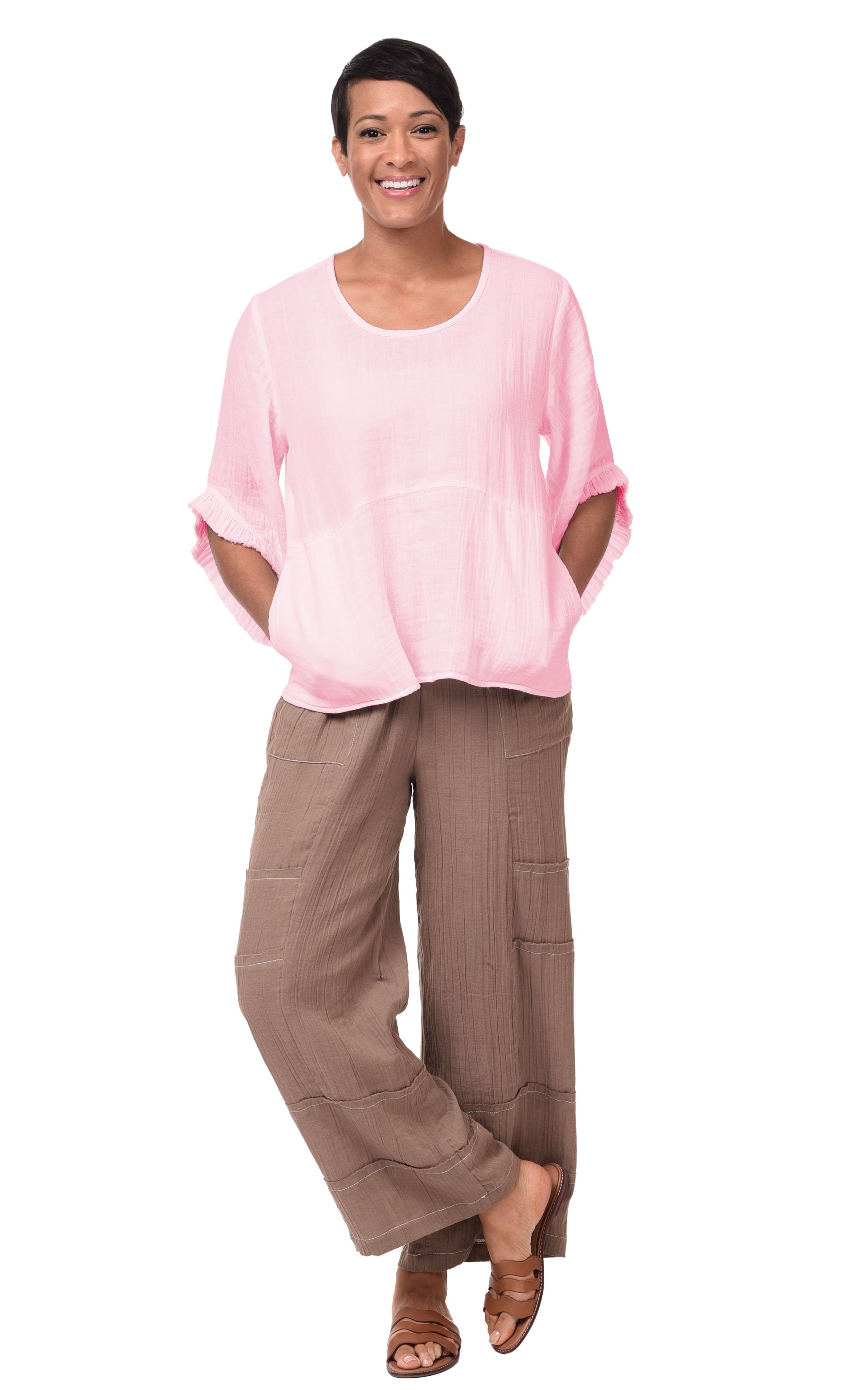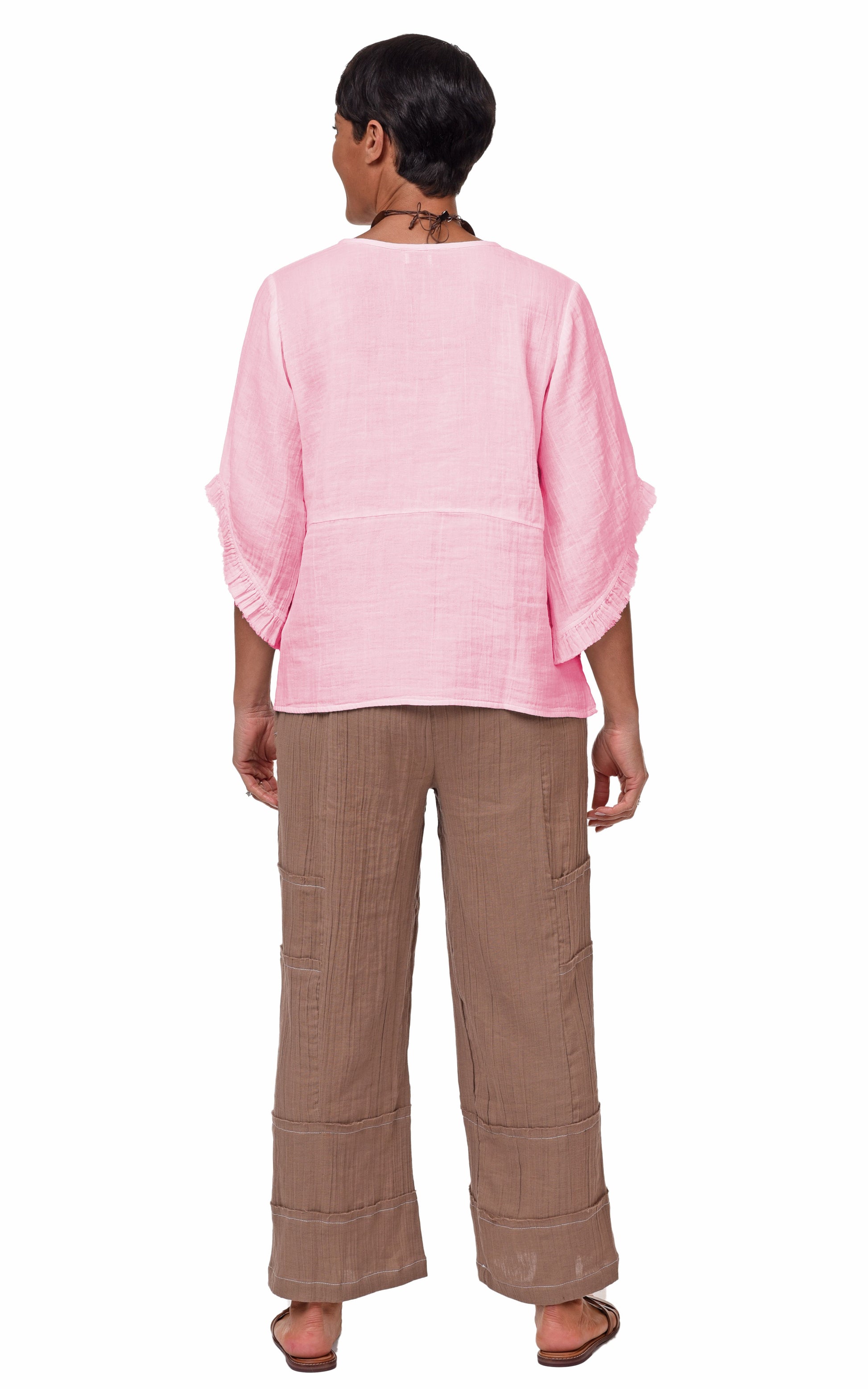 3/4 sleeve pullover with round neckline, bodice seam, raw ruffle finish on the ends of the sleeves and front pockets.
